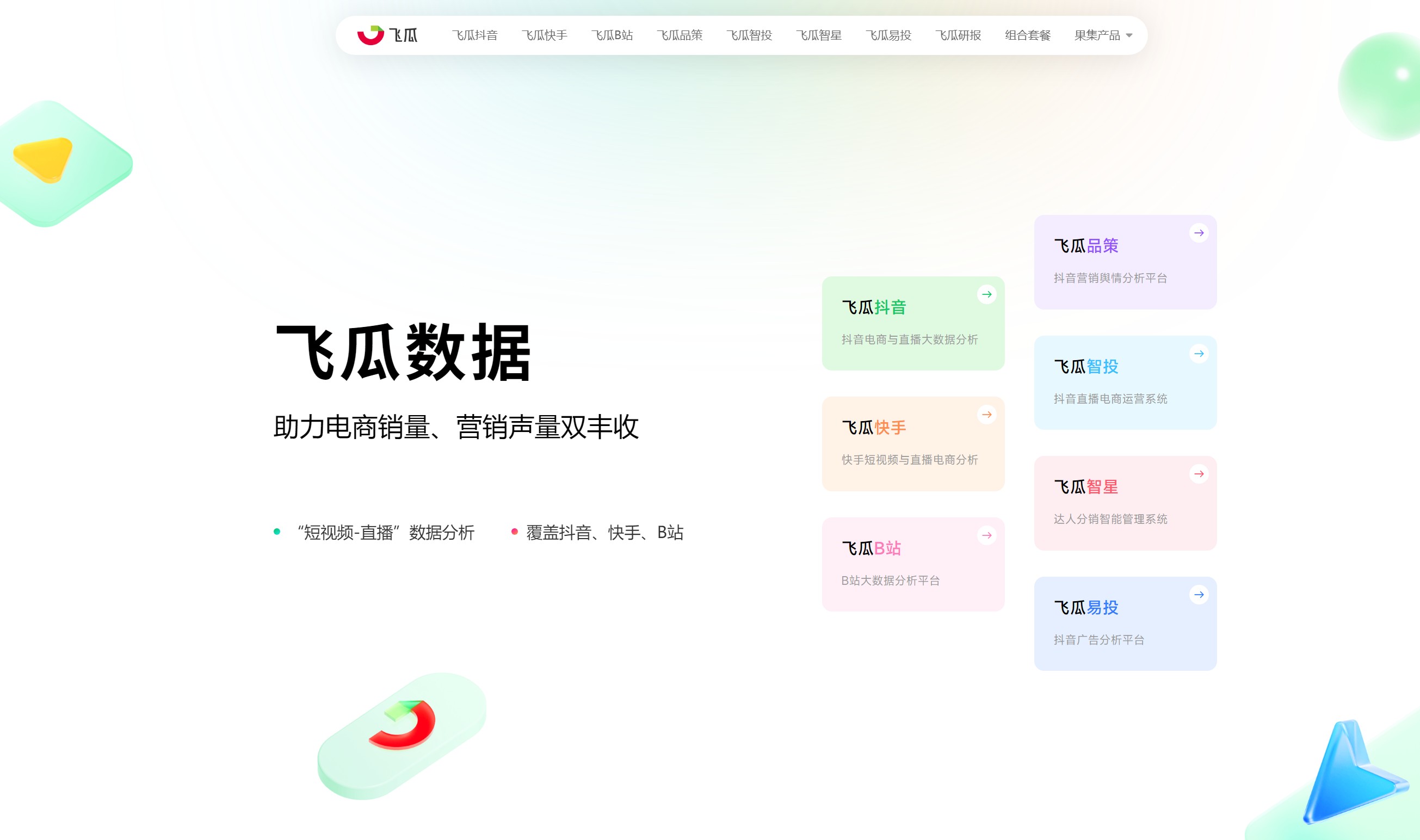 飞瓜数据是短视频领域权威的数据分析平台,提供抖音数据和快手数据等,包括热门视频、音乐,抖音快手排行榜,抖音快手电商数据,视频监控、商品监控等